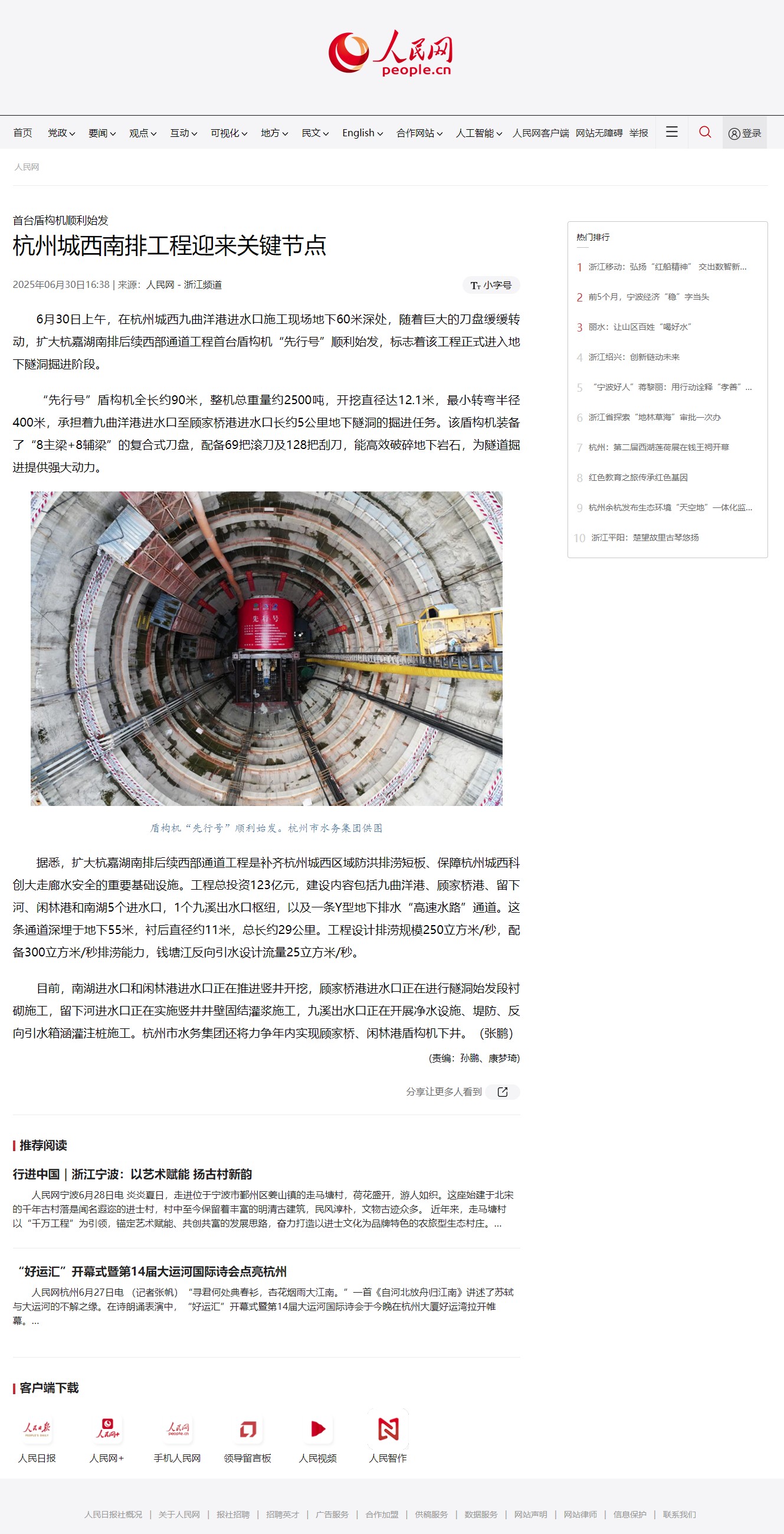 6月30日上午,在杭州城西九曲洋港進(jìn)水口施工現(xiàn)場(chǎng)地下60米深處,隨著巨大的刀盤緩緩轉(zhuǎn)動(dòng),擴(kuò)大杭嘉湖南排后續(xù)西部通道工程首臺(tái)盾構(gòu)機(jī)“先行號(hào)”順利始發(fā),標(biāo)志著該工程正式進(jìn)入地下隧洞掘進(jìn)階段。 “先行號(hào)”盾構(gòu)機(jī)全長(zhǎng)約90米,整機(jī)總重量約2500噸,開挖直徑達(dá)12.1米,最小轉(zhuǎn)彎半徑400米,承擔(dān)著九曲洋港進(jìn)水口至顧家橋港進(jìn)水口長(zhǎng)約5公里地下隧洞的掘進(jìn)任務(wù)。該盾構(gòu)機(jī)裝備了“8主梁+8輔梁”的復(fù)合式刀盤,配備69把滾刀及128把刮刀,能高效破碎地下巖石,為隧道掘進(jìn)提供強(qiáng)大動(dòng)力。 據(jù)悉,擴(kuò)大杭嘉湖南排后續(xù)西部通道工程是補(bǔ)齊杭州城西區(qū)域防洪排澇短板、保障杭州城西科創(chuàng)大走廊水安全的重要基礎(chǔ)設(shè)施。工程總投資123億元,建設(shè)內(nèi)容包括九曲洋港、顧家橋港、留下河、閑林港和南湖5個(gè)進(jìn)水口,1個(gè)九溪出水口樞紐,以及一條Y型地下排水“高速水路”通道。這條通道深埋于地下55米,襯后直徑約11米,總長(zhǎng)約29公里。工程設(shè)計(jì)排澇規(guī)模250立方米/秒,配備300立方米/秒排澇能力,錢塘江反向引水設(shè)計(jì)流量25立方米/秒。 目前,南湖進(jìn)水口和閑林港進(jìn)水口正在推進(jìn)豎井開挖,顧家橋港進(jìn)水口正在進(jìn)行隧洞始發(fā)段襯砌施工,留下河進(jìn)水口正在實(shí)施豎井井壁固結(jié)灌漿施工,九溪出水口正在開展凈水設(shè)施、堤防、反向引水箱涵灌注樁施工。杭州市水務(wù)集團(tuán)還將力爭(zhēng)年內(nèi)實(shí)現(xiàn)顧家橋、閑林港盾構(gòu)機(jī)下井。(張鵬) (責(zé)編:孫鵬、康夢(mèng)琦) 鏈接:http://zj.people.com.cn/n2/2025/0630/c186327-41276487.html |